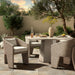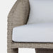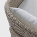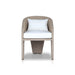 A unique three-leg outdoor dining chair based on the popular indoor silhouette. All-weather wicker framing forms a barrel-shaped back and kick back detail on the leg, accented by a box seat cushion with knife edge back cushion. Covered in 100% olefin, known for its UV-resistant, water-repellent and quick-drying abilities. Cover or store indoors during inclement weather and when not in use. Our Weatherproof Outdoor Dining Chair Cover in size large fits this chair.